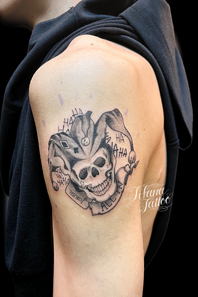 ジョーカーのタトゥー GALLERY ARTIST TOMO 2025.10.07 文字とジョーカーを組み合わせたタトゥー。所要時間の目安は2時間未満です。 MOTIF スカル SIZE タバコサイズ PARTS 腕 #ジョーカー SHARE