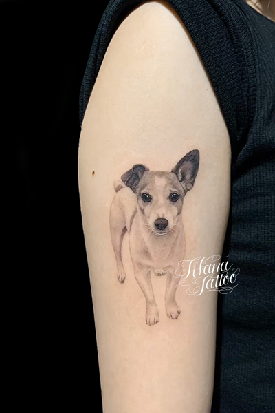 愛犬のポートレート・タトゥー GALLERY ARTIST AKI 2026.03.30 愛犬の写真をリアルに再現したポートレート・タトゥー。完成までの施術回数は2回です。 STYLE ファインライン MOTIF 犬 SIZE タバコサイズ PARTS 腕 SHARE