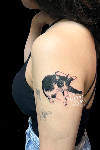 持ち込み|猫のタトゥー GALLERY ARTIST TOMO 2025.12.14 持ち込みデザインの猫|ネコのデザインを彫ったタトゥー。所要時間の目安は1.5時間程度です。 MOTIF 猫 SIZE タバコサイズ PARTS 腕 SHARE