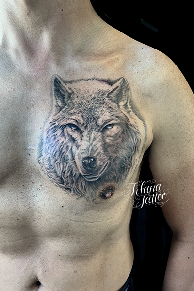 狼のファインライン・タトゥー GALLERY ARTIST KAZ 2025.12.28 狼|オオカミの顔を繊細に毛並みまで細かく表現したファインライン・タトゥー。完成までの施術回数の目安は2回です。 STYLE チカーノ、ブラック&グレイ MOTIF 動物 SIZE B5サイズ以上 PARTS 胸 #オオカミ SHARE