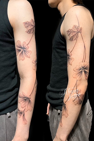 葵|アオイのボタニカル・タトゥー GALLERY ARTIST AKI 2026.02.16 葵|アオイの花がモチーフのタトゥー。1回の施術で完成可能です。 STYLE チカーノ、ブラック&グレイ MOTIF 植物 SIZE ハーフスリーブ PARTS 腕 SHARE