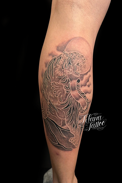 虎のタトゥー GALLERY ARTIST MICA 2026.03.31 白いアウトラインで虎を描いたタトゥー。完成までの施術回数は2回です。 STYLE 和柄 MOTIF 動物 SIZE B5サイズ以上 PARTS 脚 #虎 SHARE