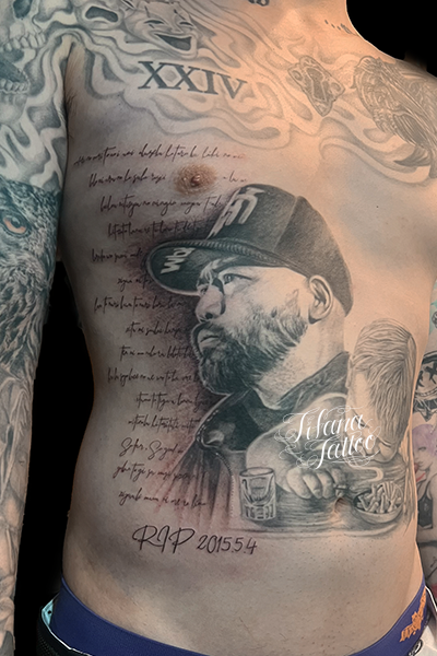 DEV LARGEのR.I.P TATTOO GALLERY ARTIST KAZ 2026.01.18 DEV LARGEの写真をリアルに再現したポートレート・タトゥー。完成までの施術回数の目安は4回前後です。 STYLE チカーノ、ブラック&グレイ MOTIF ポートレイト SIZE B5サイズ以上 PARTS 脇 腹 SHARE